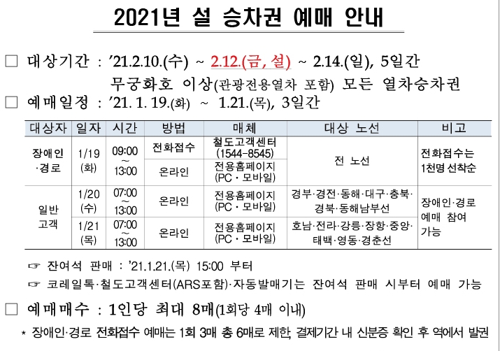 2021년 2월10일부터 2월14일까지의 5일간의 설날 기간 동안의 설날기차표는 관광전용열차 포함 무궁화호 이상 모든 열차 승차권을 예매할 수 있습니다.