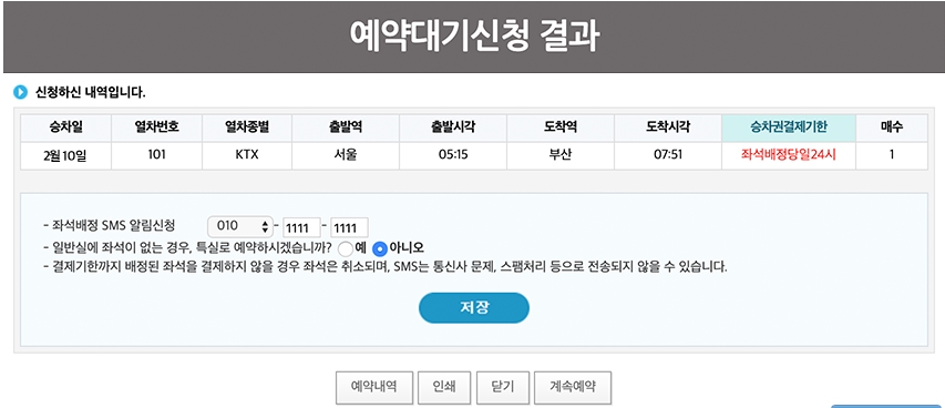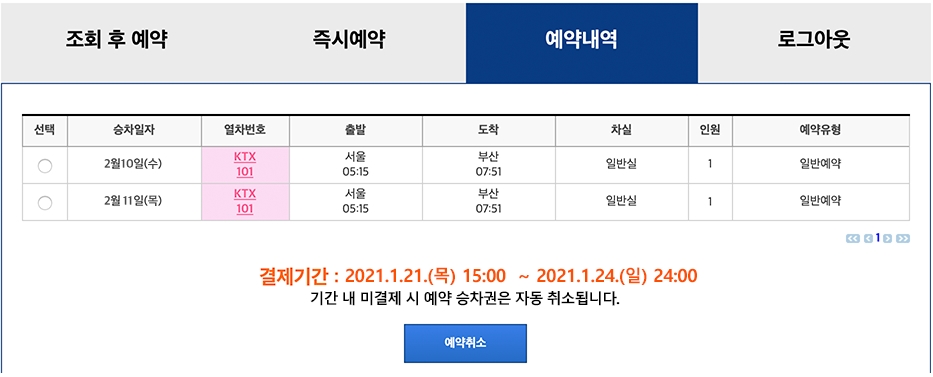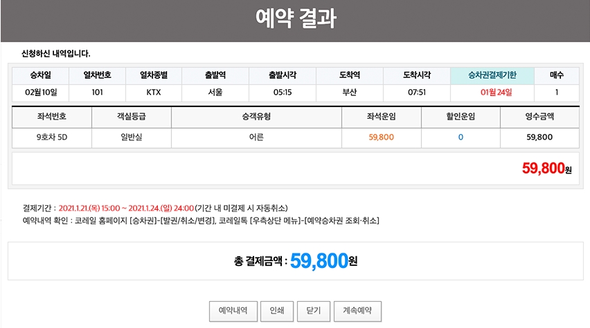 즉시 예약 또는 조회 후 예약을 한 후 예약 결과 또는 예약 대기 신청 결과가 화면에 표시될 것입니다. 이렇게 설날기차표 예매 예약 확인을 한 후에 잊지말고 1월21일 목요일 오후 3시부터 1월24일 24시까지 반드시 결제를 마치셔야 합니다. 안그러면 바로 자동취소됩니다.