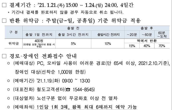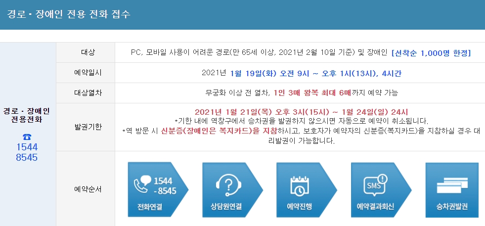 설날기차표 예매 자체는 오로지 코레일 홈페이지 PC, 모바일에서만 가능합니다. 다만 PC나 모바일 사용이 어려운 만 65세 이상의 어르신과 장애인을 대상으로 선착순 1,000명 한정으로 전화로 예매 접수할 수 있습니다. 이 기간은 좀 더 짧아서 2021년 1월19일 화요일 오전 9시부터 오후 1시까지입니다. 잘 확인하셔서 예매하시기 바랍니다.