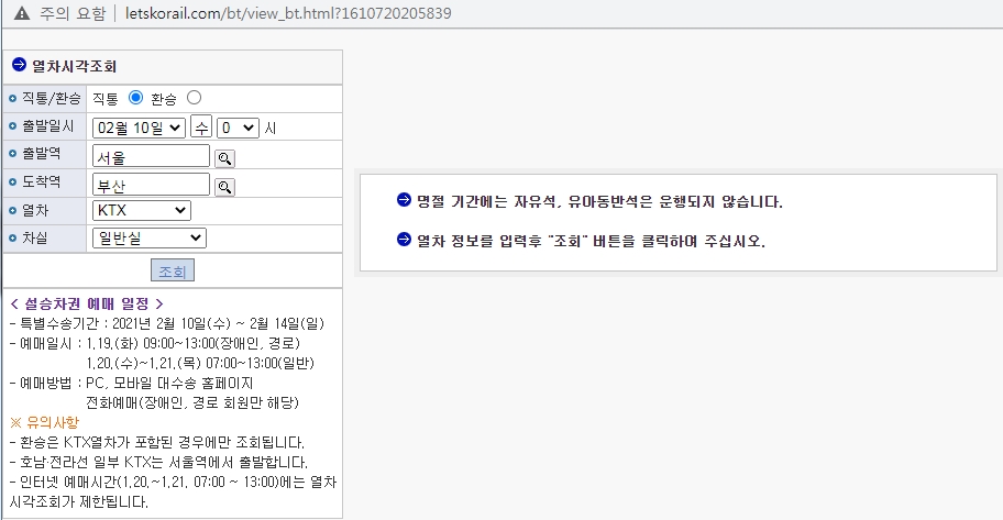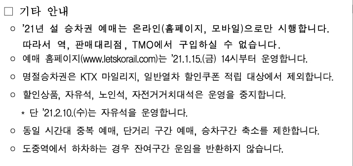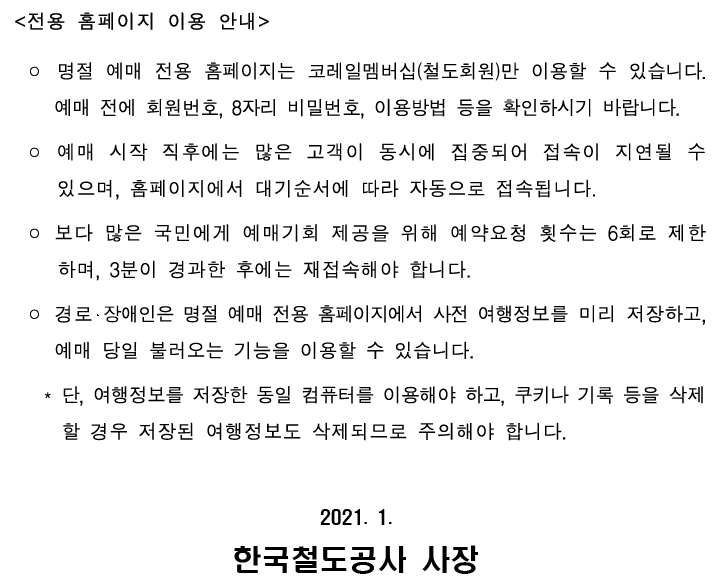 2021년 설날기차표 예매 일정